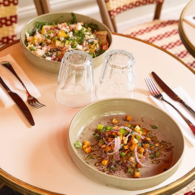 Notre cuisine est 100 % faite maison. Elle mêle les parfums du Sud, les souvenirs d’enfance, les dîners entre amis et l’envie de vous faire plaisir, tout simplement. Des assiettes colorées, des produits choisis avec soin, des pains maison à partager… Tout est pensé comme une invitation à voyager et à vivre un moment chaleureux autour de la table.